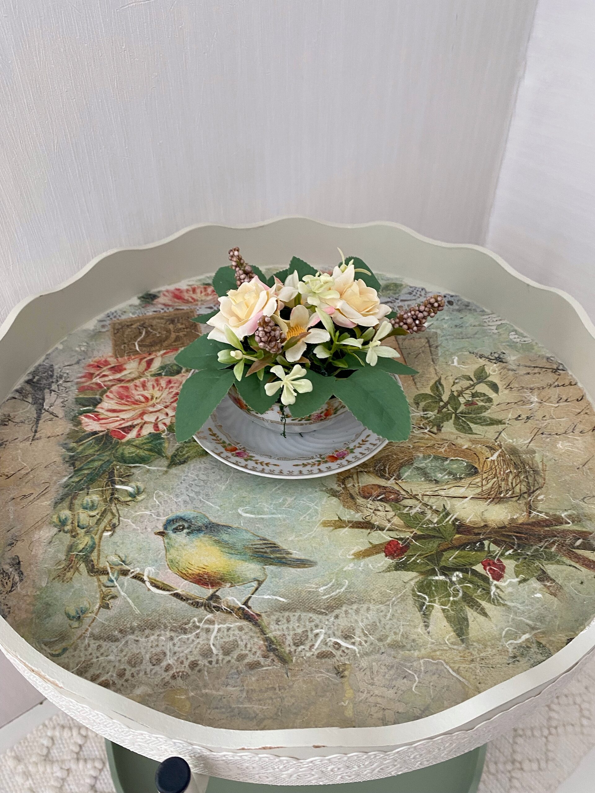 Riiuleid saab omavahel vahetada, võimaldades muuta laua välimust vastavalt soovile. Komplekti kuulub ka portselanist tass koos alustaldriku ja mini lilleseadega, mis täiendab laua dekoratiivset tervikut.