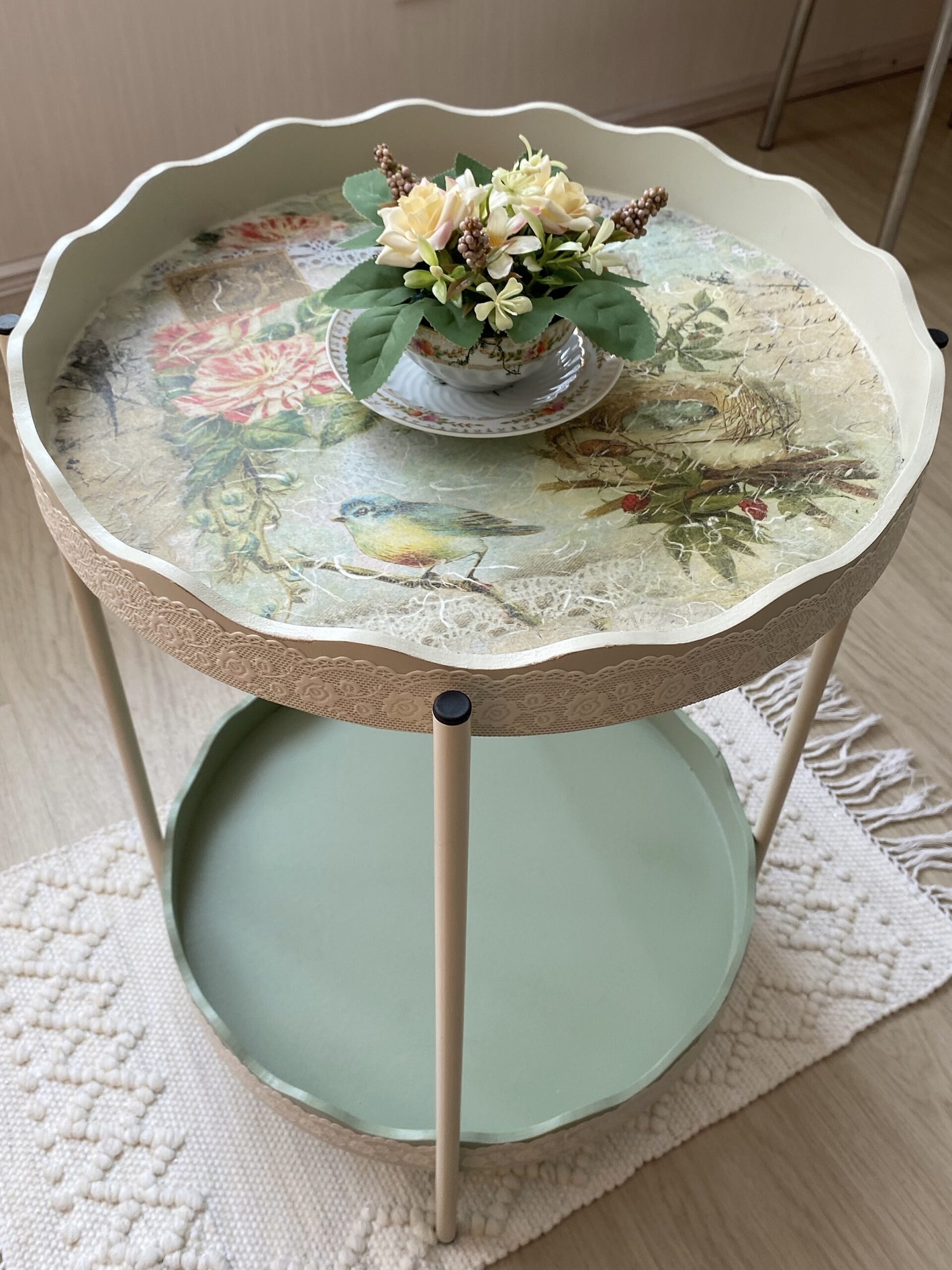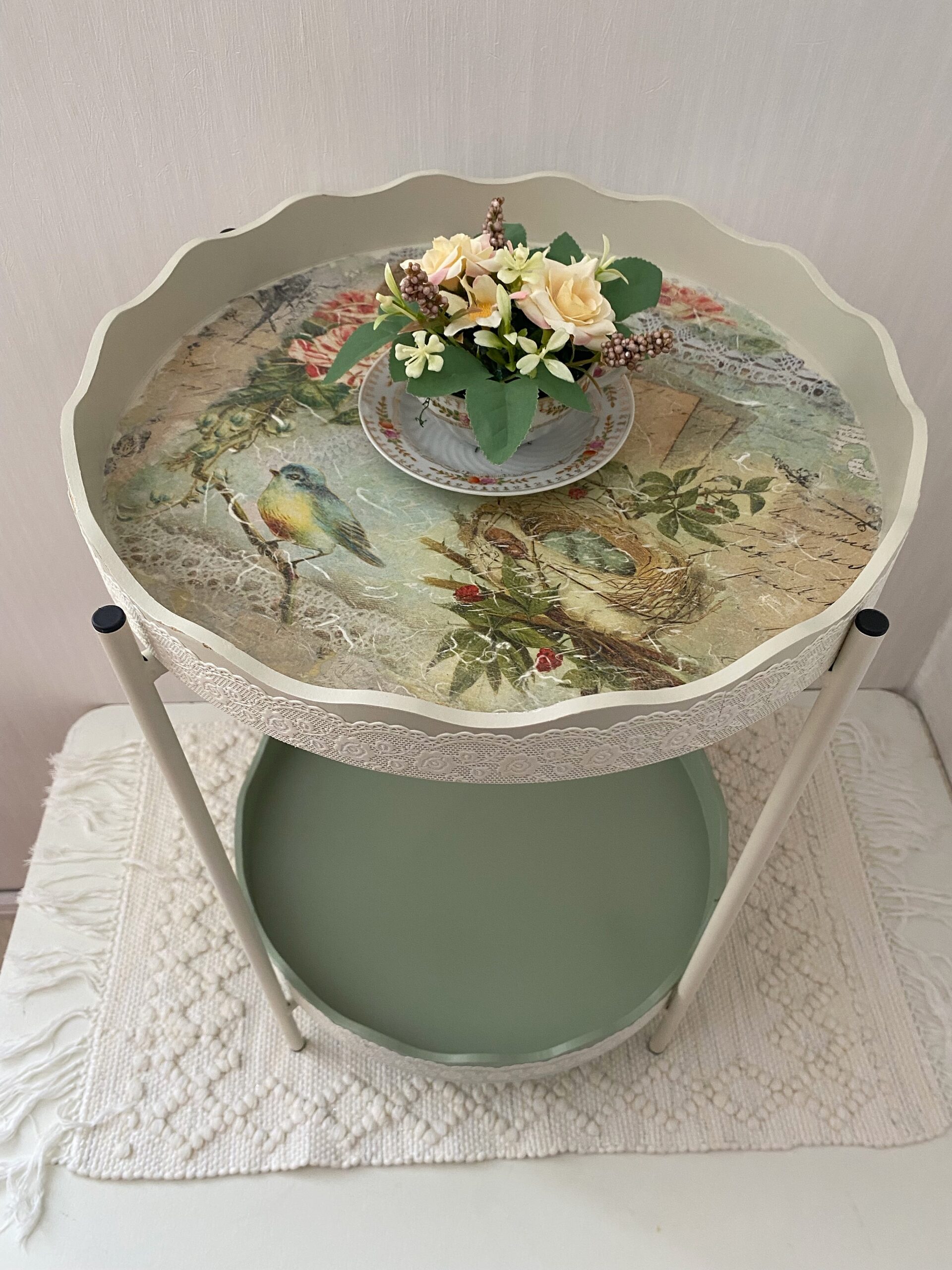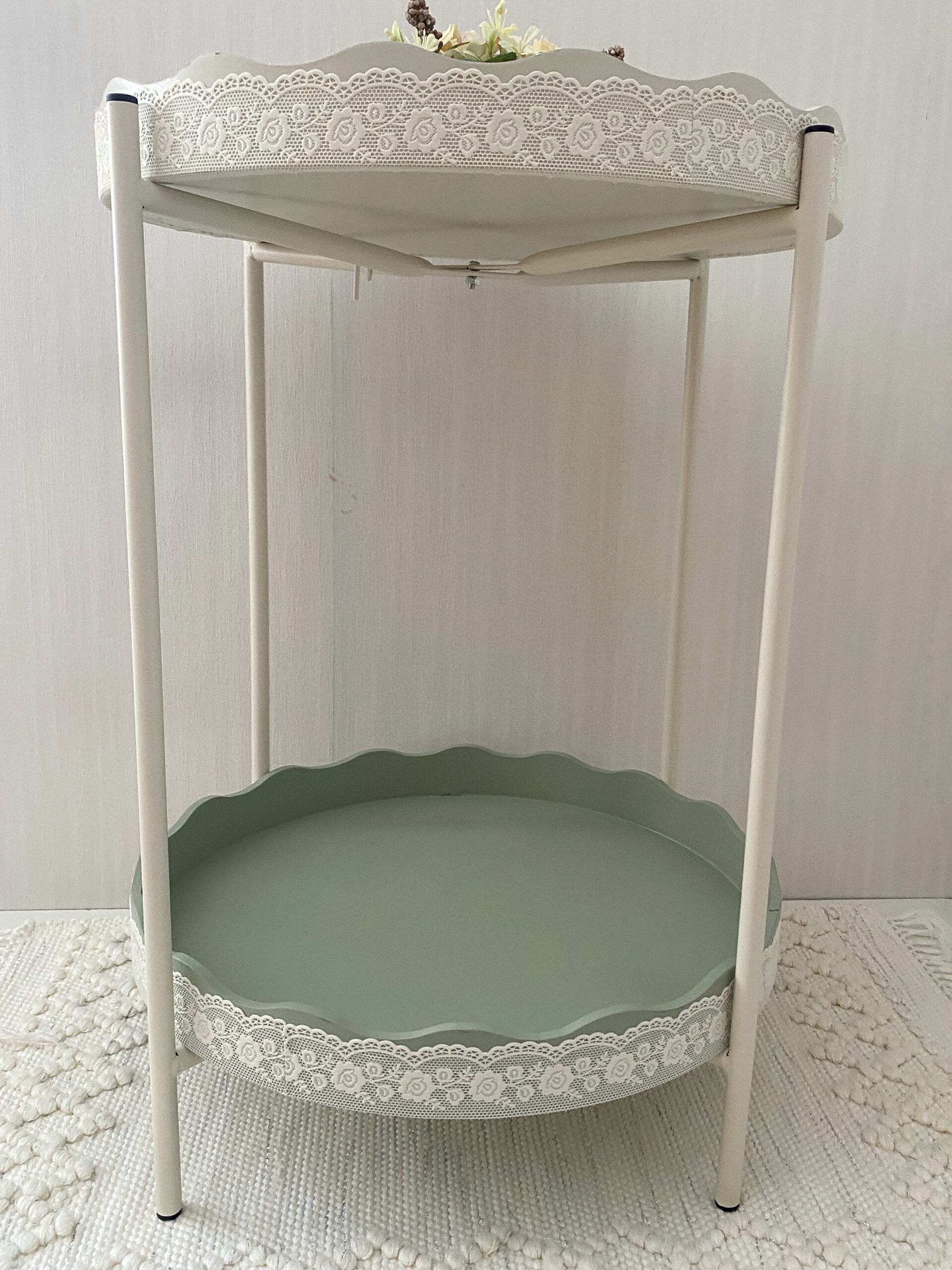 Elegantne ja romantilise stiiliga kahe riiuliga dekoratiivne kokteillaud lisab sinu koju pehmust, iseloomu ja vintage-hõngu. Laud on valmistatud MDF-plaadist riiulitest ja tugevast metallraamist ning viimistletud riisipaberi ja dekoratiivse kummipitsiga, mis loob ainulaadse ja kunstilise välimuse.
