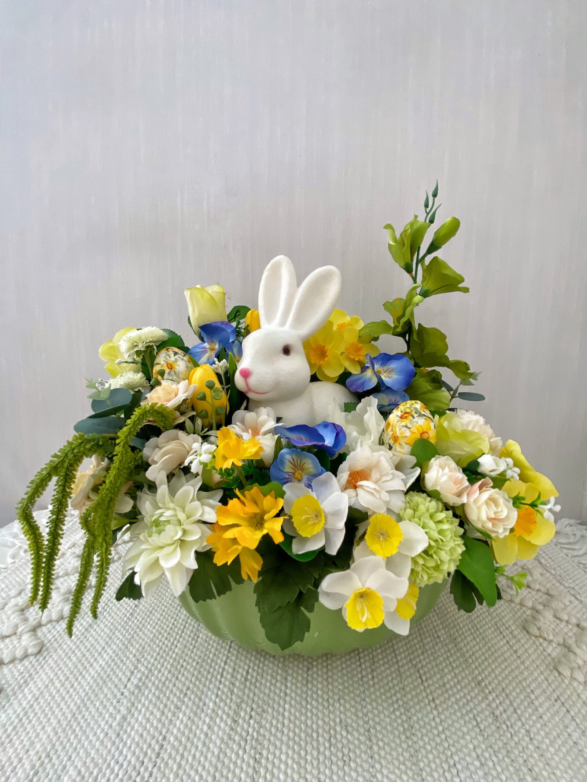 Too oma koju kevadine värskus ja lihavõtete rõõmus meeleolu selle suure ja pilkupüüdva lilleseadega. Kompositsiooni keskmes on sametkattega dekoratiivne istuv jänes, mida ümbritsevad rikkalikud kevadlilled ja rohelus, luues elava ja harmoonilise terviku.