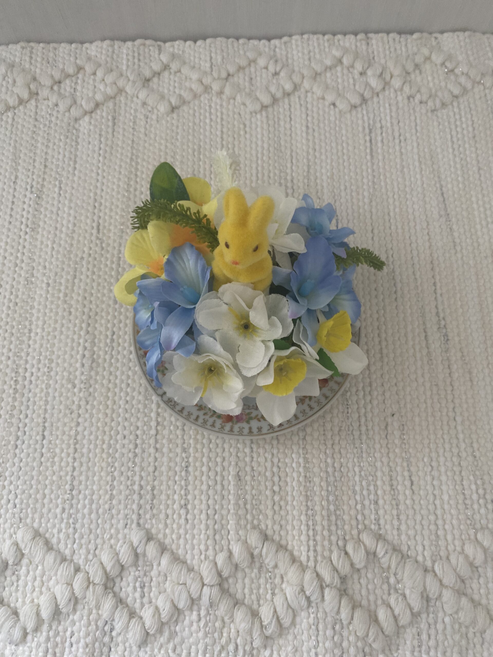Minimalistlik ja kaunis lilleseade, mis on kujundatud taaskasutatud portselantassile. Õrnades ja pehmetes toonides kunstlilled loovad rahuliku ning elegantse meeleolu.
